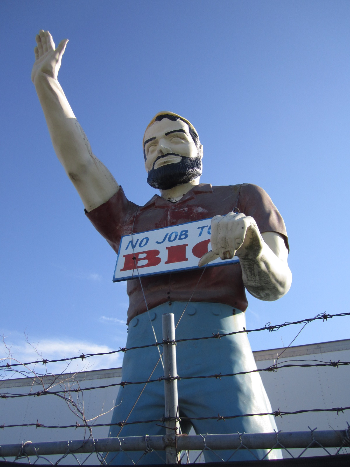 This unique Bunyan version stands to the west of St Louis at Skyline Motors along I-70 and holds a big sign that says “No Job to Big”. He is a classic Bunyan except he has the arm pose of a chief version! In all my years of muffler man hunting and research, he is the only one like this that I know of with a raised right hand salute and not the standard Muffler Man pose that could hold an axe. To learn the full history of this giant and the interesting back story, check out the full article which has recently been updated and moved to our Patreon Account. Please join us for there for full access.