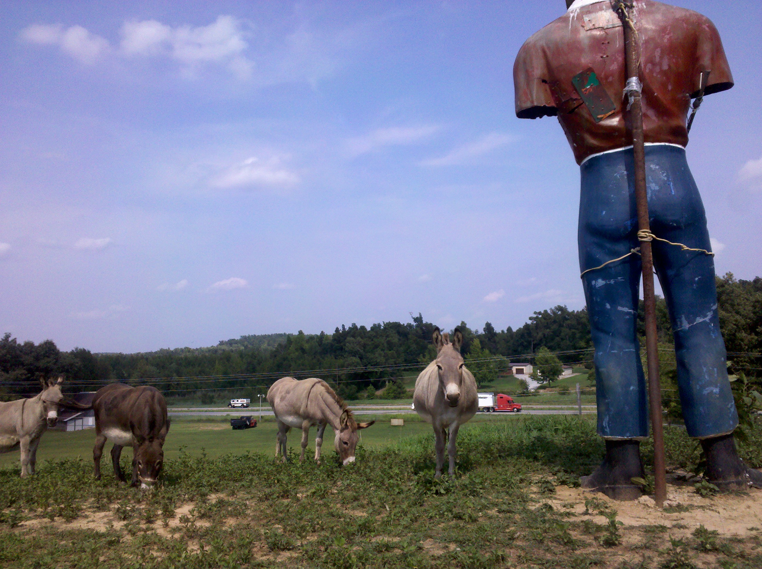 This 14 foot tall Paul Bunyan statue stands in a donkey pasture overlooking Pennyrile Parkway in rural Kentucky. These smaller statues are rarer than the 20 foot tall models. This particular giant has since been fully restored and has a fascinating back story. His restoration marks the start of our restorations back in 2015 and we have been doing them ever since for almost 10 years now.