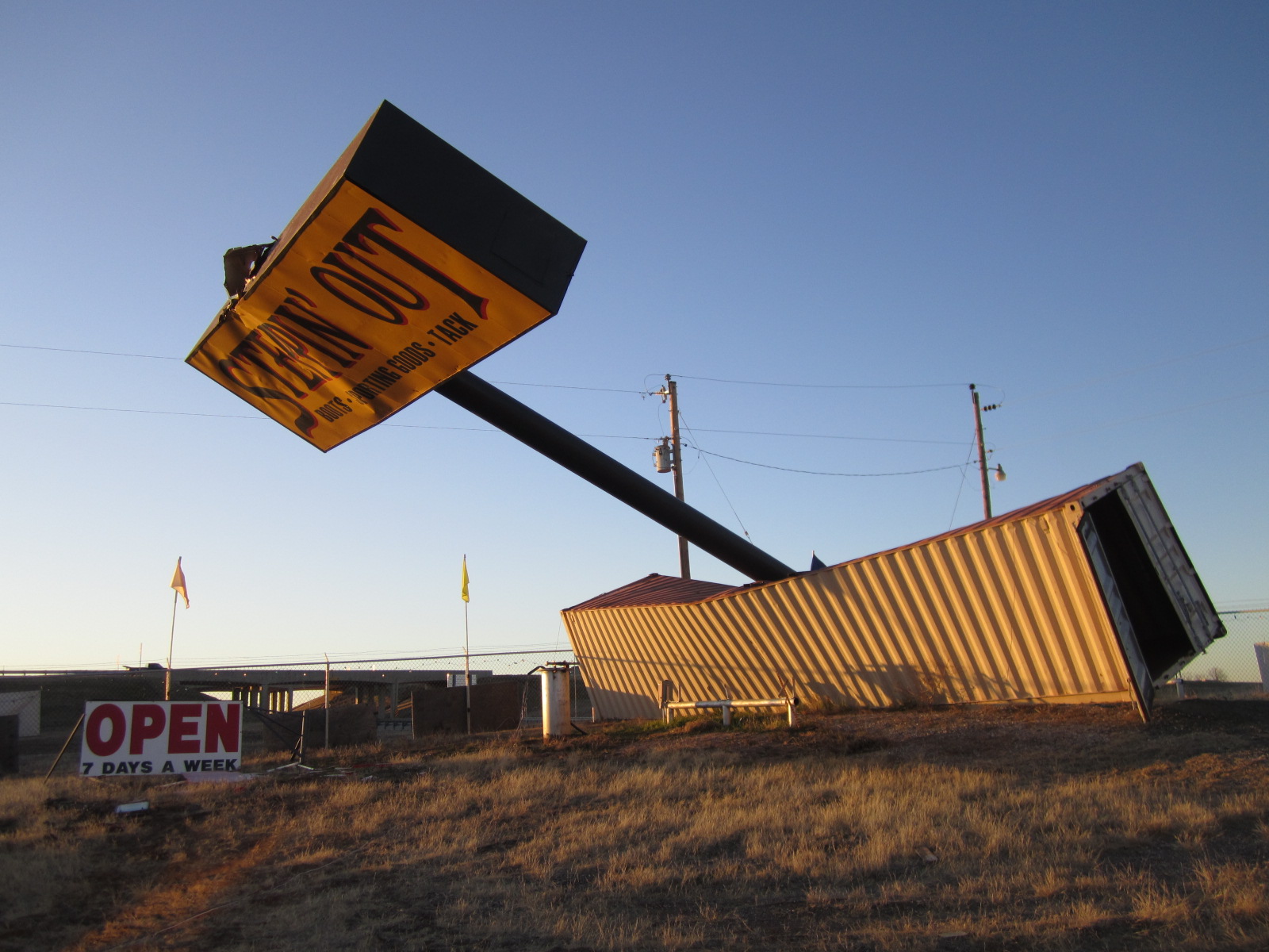 Around 2008 he was bought by Steppin Out Western Wear and was moved to Wynnewood, OK and stood along the interstate on top of a shipping container next to the store sign. That all changed during a storm in mid December 2011 that blew the sign over and brought him down with it. He was smashed up pretty good and by the time I got there on January 4 he was laying out back in 3 pieces and waiting for repairs. The owner of Steppin Out enjoys collection fiberglass statues and has a large collection of animals for sale as well as a few permanent fixtures like the muffler man and a large boot on the roof. When I was there he was planning on shipping the m man north to either Nebraska or Oklahoma City for repair and by July of 2012 I started seeing pictures online of him back at Steppin out all back together again.