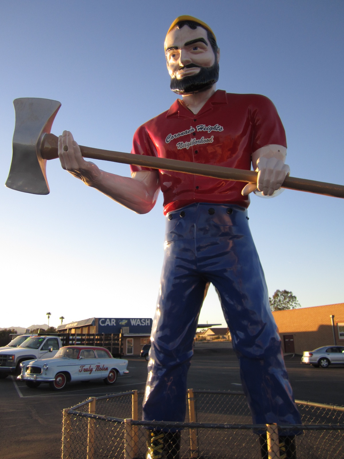 IMG_7666This classic Bunyan started appearing on roadside america reports as early as 1997 but actually arrived in the area around 1964. He was set up by Leo Toia and his family still runs the hot rod shop here after all these years. When I visited him he looked great with a fresh paint job, blue pants, red shirt and yellow knit cap which seem to be the standard colors for these Bunyans. His shirt says “Caranada Heights Neighborhood”. To learn the full history of this giant and the interesting back story, check out the full article which has recently been updated and moved to our Patreon Account. Please join us there for full access!