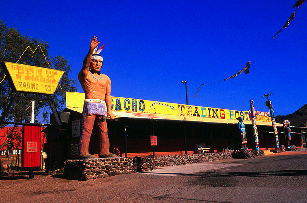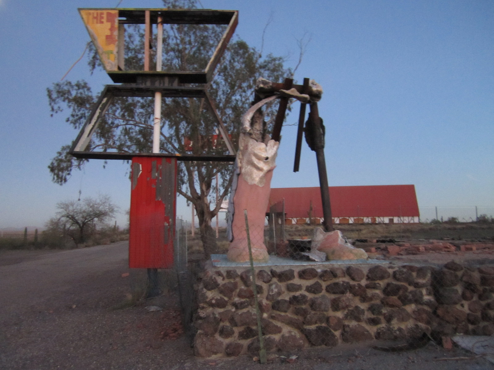 at the site to this day and believe it or not I’m not the only one that still stops by to pay my respects! It has been over 20 years since a fire burned the place to the ground but you can still drive up and check out the old site and sign. Back in the day this was a popular place to stop between Tucson and Phoenix, AZ. It was visible from the interstate and was full of interesting things for visitors to look at and buy. On November 16,2002 and electrical problem started a fire that was finally put out by the fire department but not before it burnt the entire store to the ground and most of the muffler man standing nearby. When it was over part of his right leg remained as well as his half burnt arms.