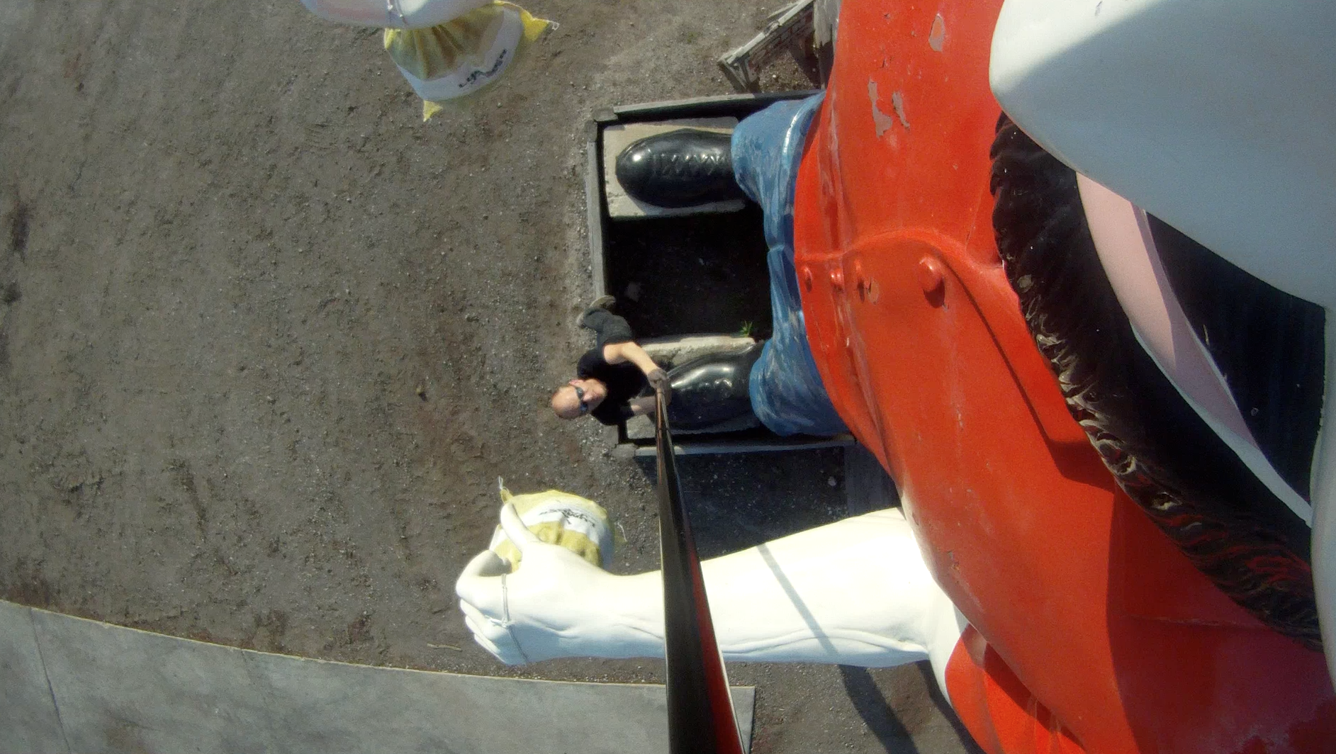 In 2007 two other muffler men arrived in Crystal Lake not far away at a greenhouse and at first it seemed the bunyan version had been moved to Lumberjacks. The other two muffler men had arrived from Ozzies Waterpark and they were footless and neither of them was a bunyan version so I ruled that out quickly. Our A.G. crew arrived in the May of 2012 and found the giant holding two big bags of mulch. We were new to the game and it was one of the first giants we started shooting extensively with the go pro