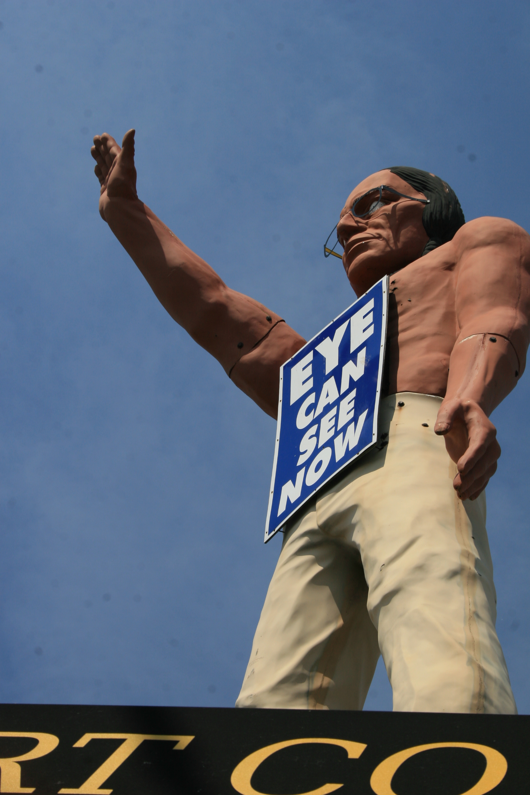 The Eye Care Indian is a must on any Muffler Man excursion in the Chicago area. The statue has been there since the 1970s or possibly the 1960s. We visited him while shooting for Episodes #5-7 in the Chicago area for American Giants. Bo stayed in the car the entire time while Neto and I ran around shooting photos and video. Since it was the weekend and the business was closed, we didn’t have a chance to talk with anyone about the statue’s history.