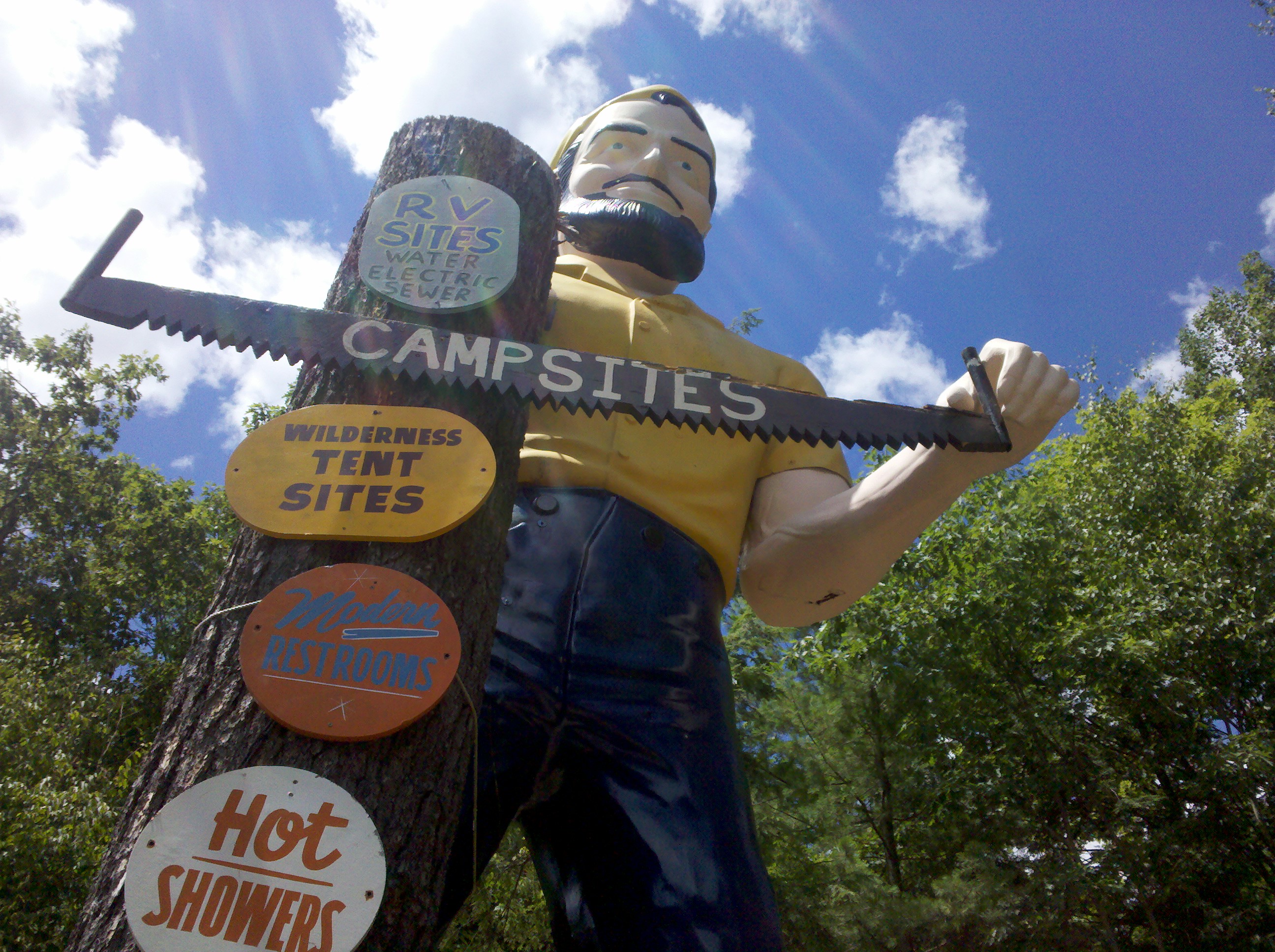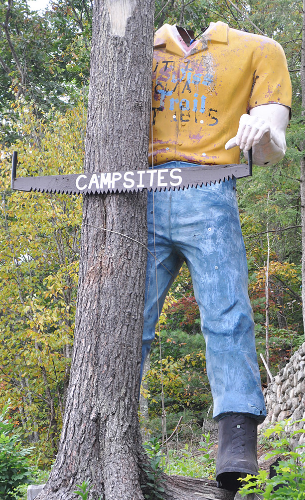The Lake Luzerne Muffler Man statue has always been one of my favorites. Ever since I saw a photo at RoadsideAmerica.com of this Paul Bunyan standing in the woods without a head and coming apart at the waist, this unfortunate statue has intrigued me. It is located near Lake George, NY where there are five other Muffler Men. Among them is the statue from the 1964 World’s Fair in New York now standing at Around the World Mini Golf in downtown Lake George. The rest of the area’s Muffler Men are located at Magic Forest, a recreational park for children.