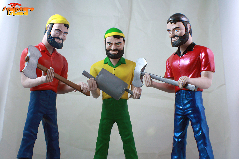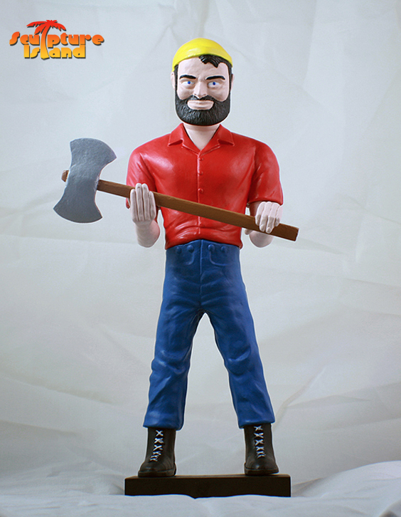 Recently, I became aware of some new Muffler Man figures, made in early 2015, that very closely resembles the one sold by the Lumberjack Café back in the 1960s. Scott Farmer, self-described as a human 3-D printer, is a sculptor who has created a few of these figures which he sells at his website, Sculpture Island. Farmer discovered Muffler Men a few years ago and has spent many hours researching their history at roadsideamerica.com and watching our American Giants episodes. He has produced seven different versions of the Paul Bunyan statues, including replicas of the statues in Elmsford NY, and Evergreen Park, IL Each statue is a hand painted resin cast of an original polymer clay sculpture. The statues are a little over 12 inches tall and come with either an axe or a muffler. These figures are the biggest and most elaborate pieces that he has made. You can purchase them through Scott’s stores at Etsy and eBay.