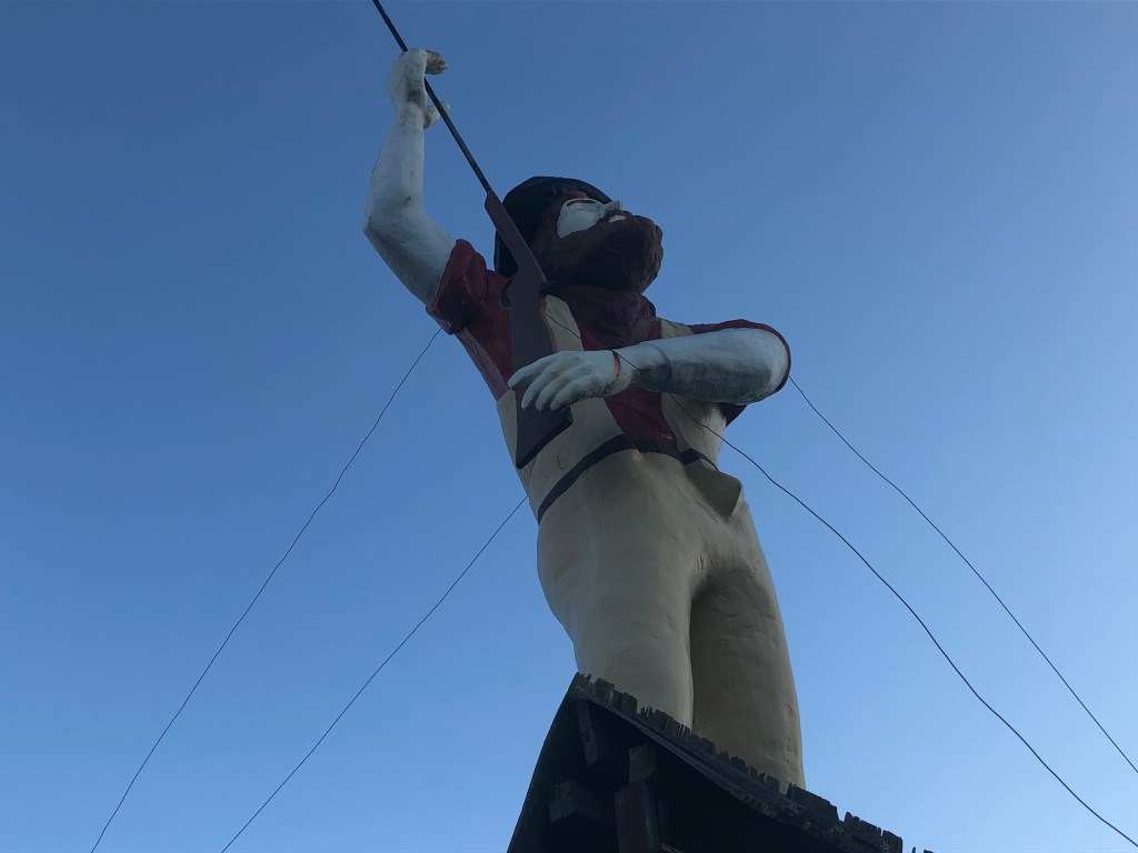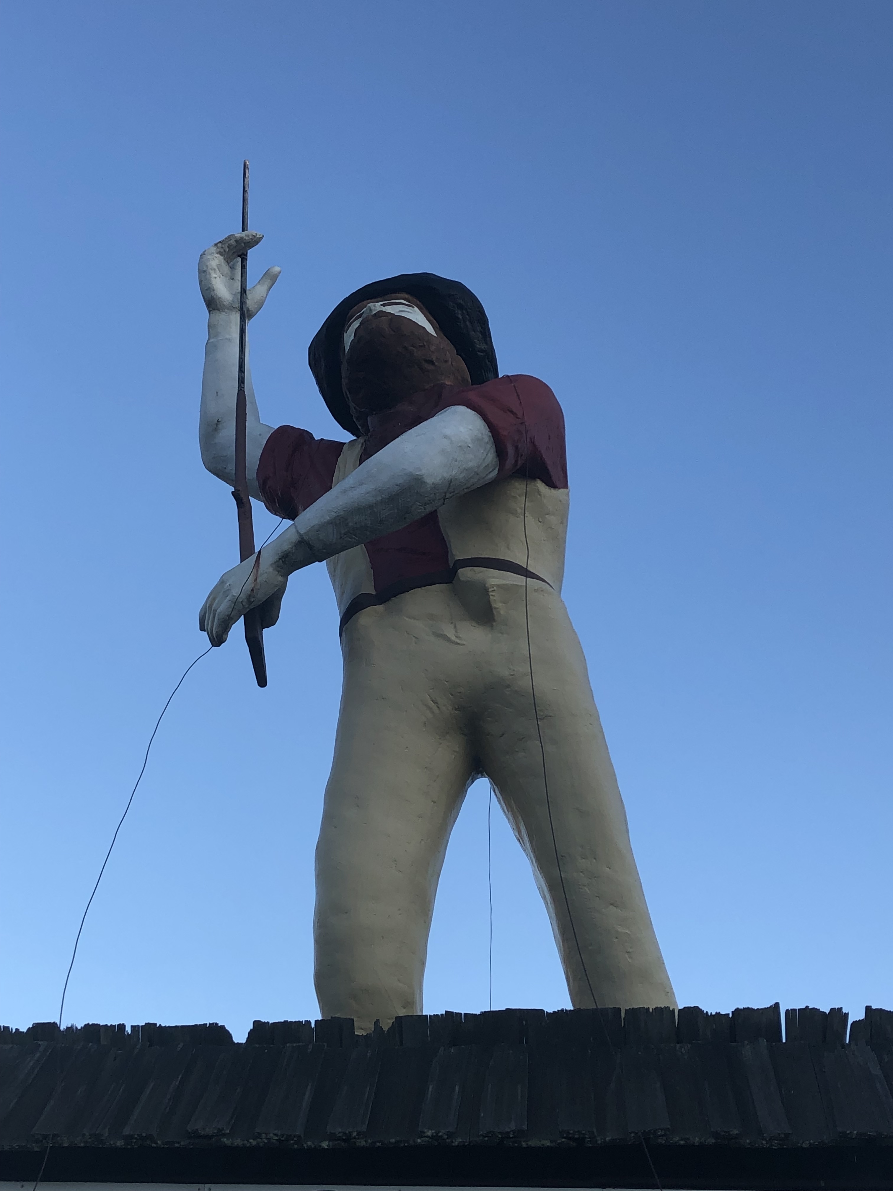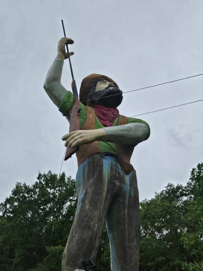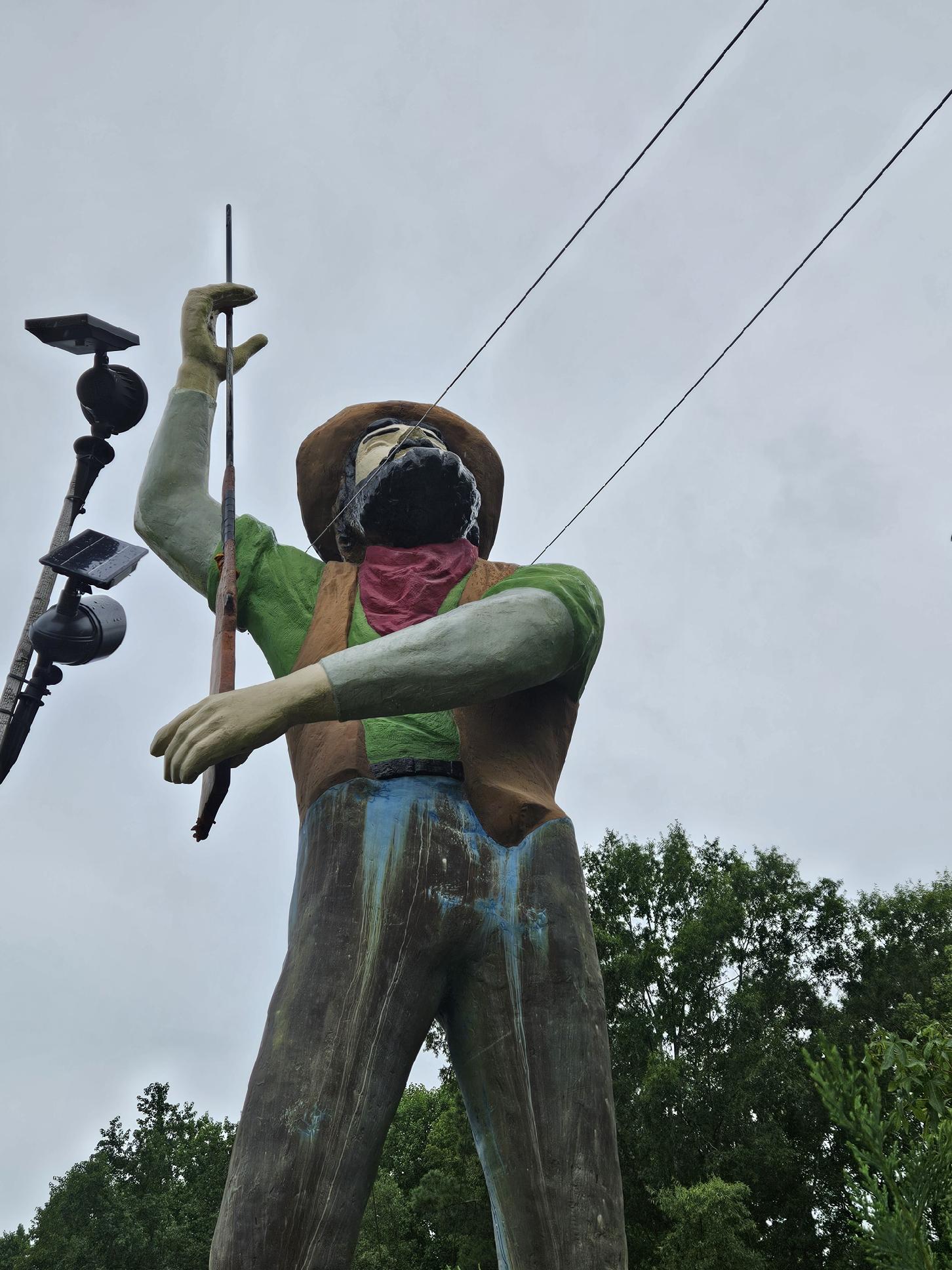 INFO – Statue is roughly 19 ft tall with an estimated weight of 500 pounds (could be less). Statue comes with rifle and is sold as is. Statue has brackets in his boots that he bolts down with and also is held by wires to his eye bolts in his shoulders. He is currently on a 10ft platform that the owner is willing to discuss if you are interested in that as well. Buyer is responsible for take down and transport but keep in mind the owner has access to cranes at an affordable rate. Seller will give up to a month for buyer to come get the giant. American Giants is available to talk about take down and transport and suggest options. Statue is located at Four Oaks, NC. Please do not attempt to contact seller directly at this time.