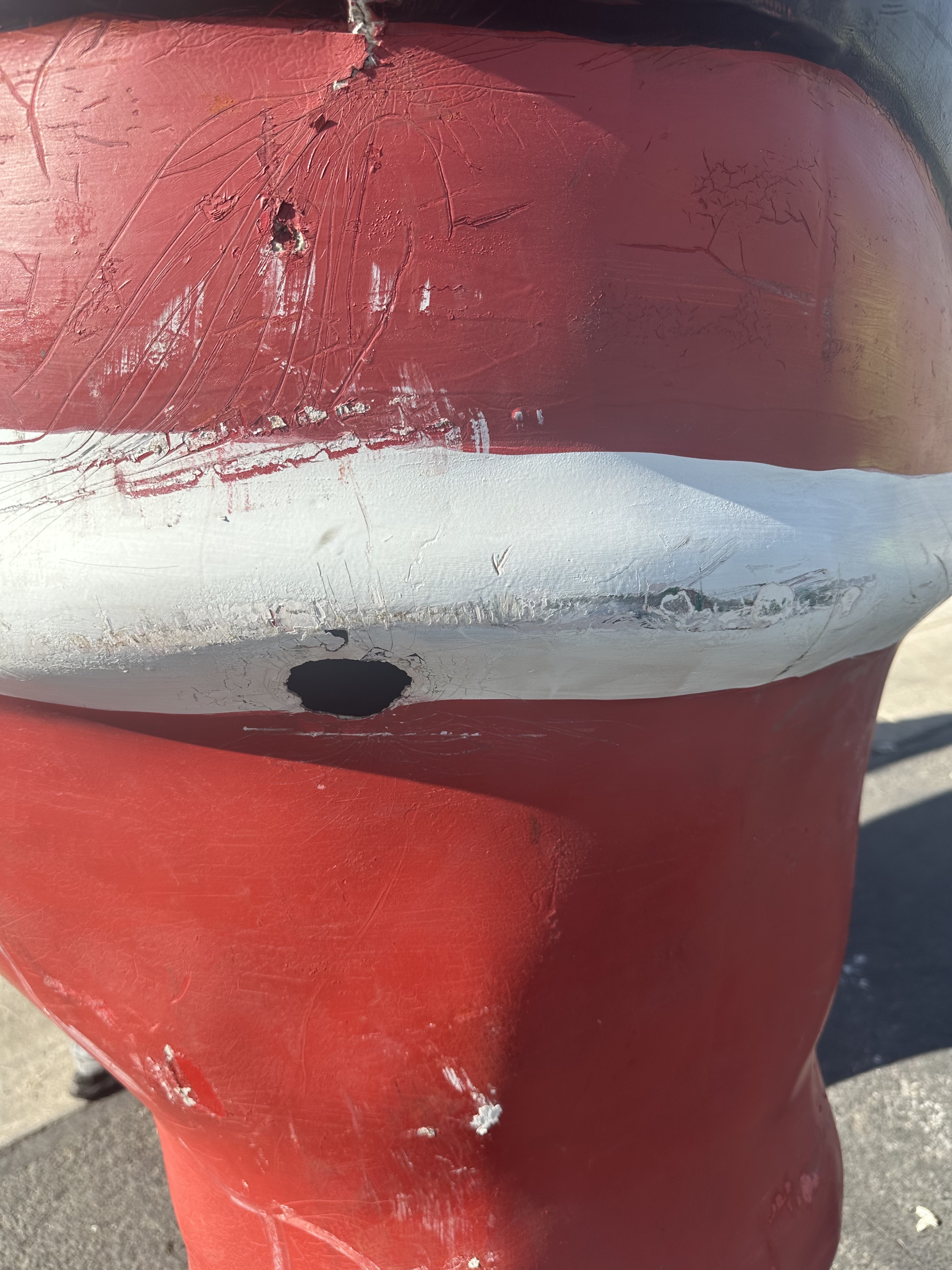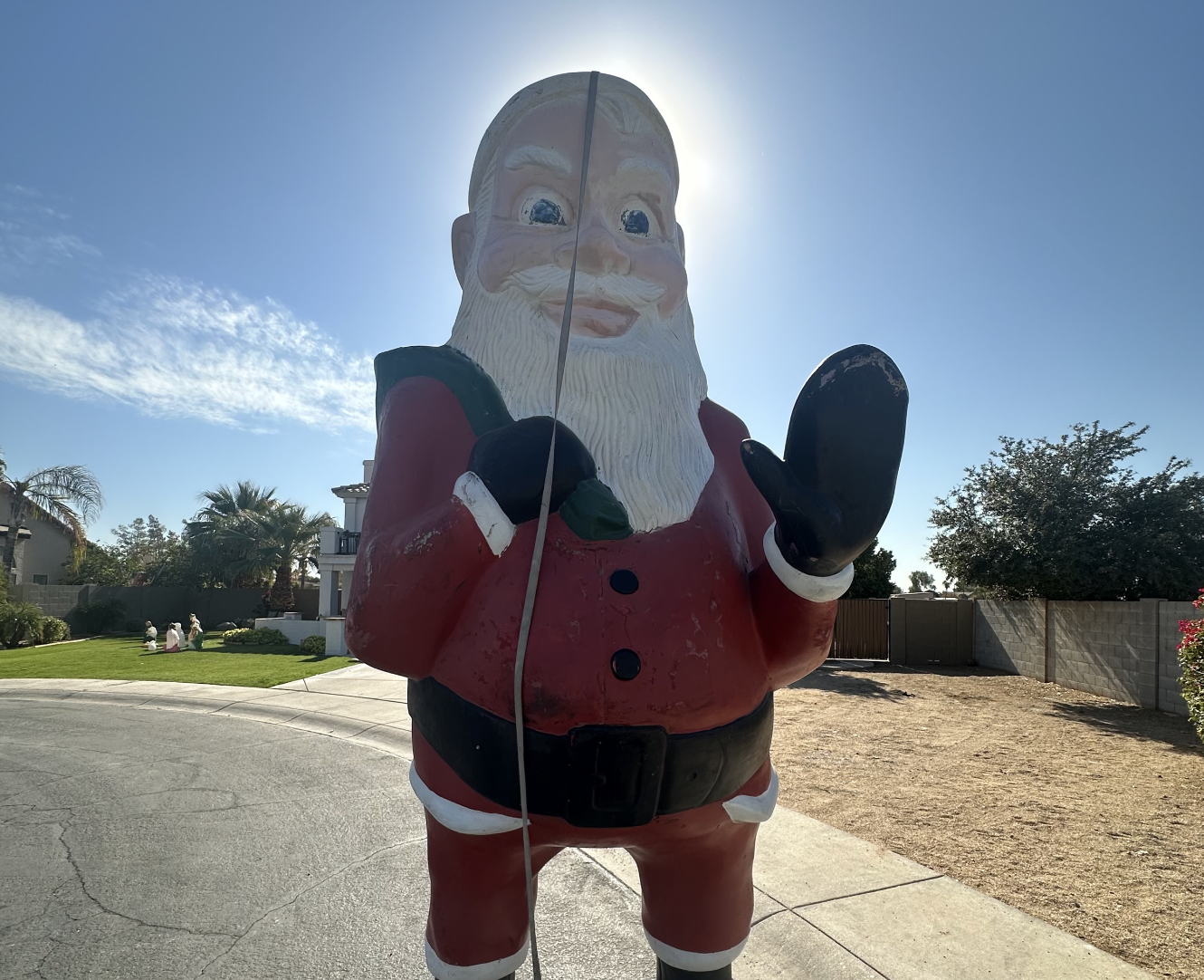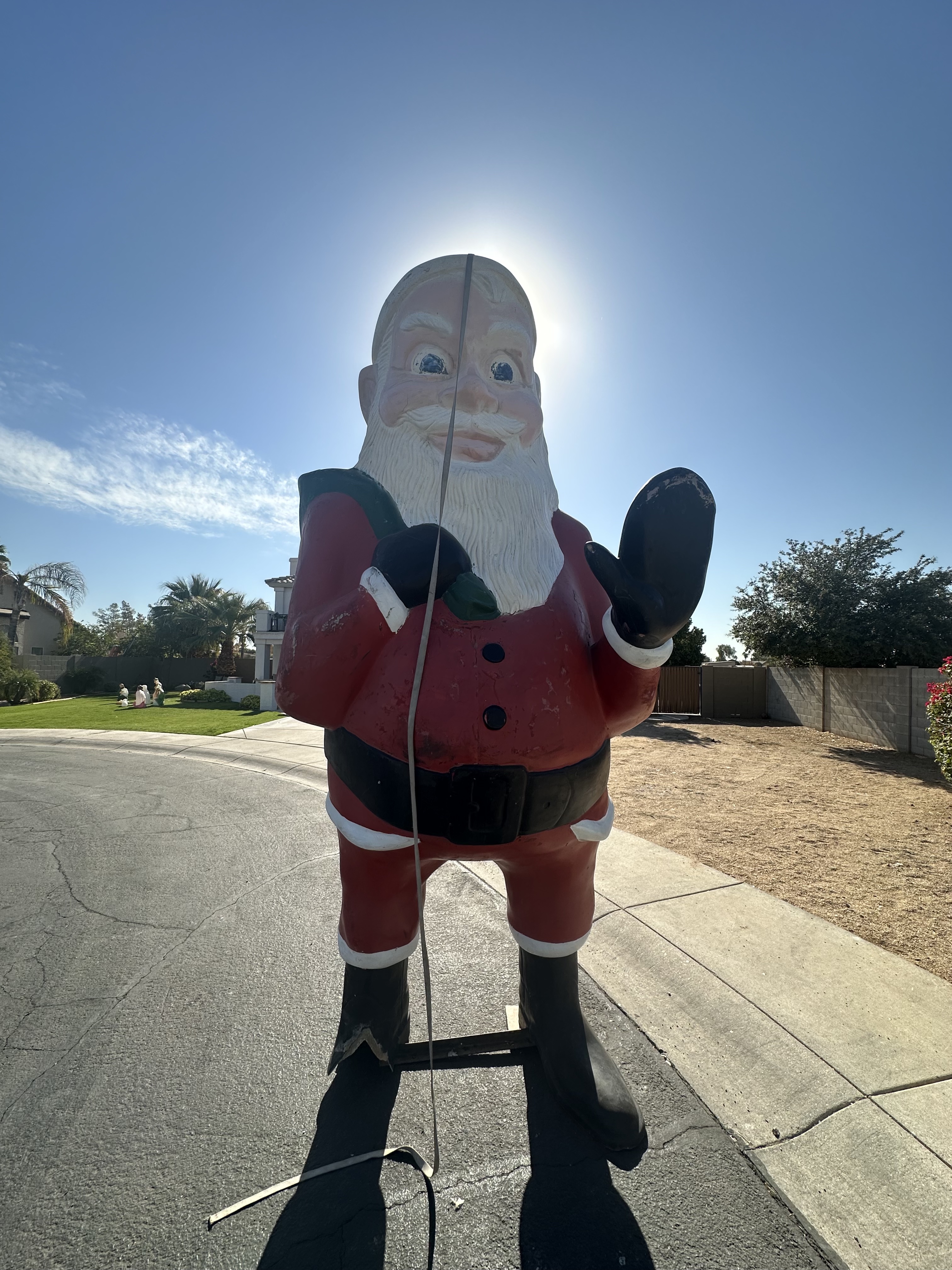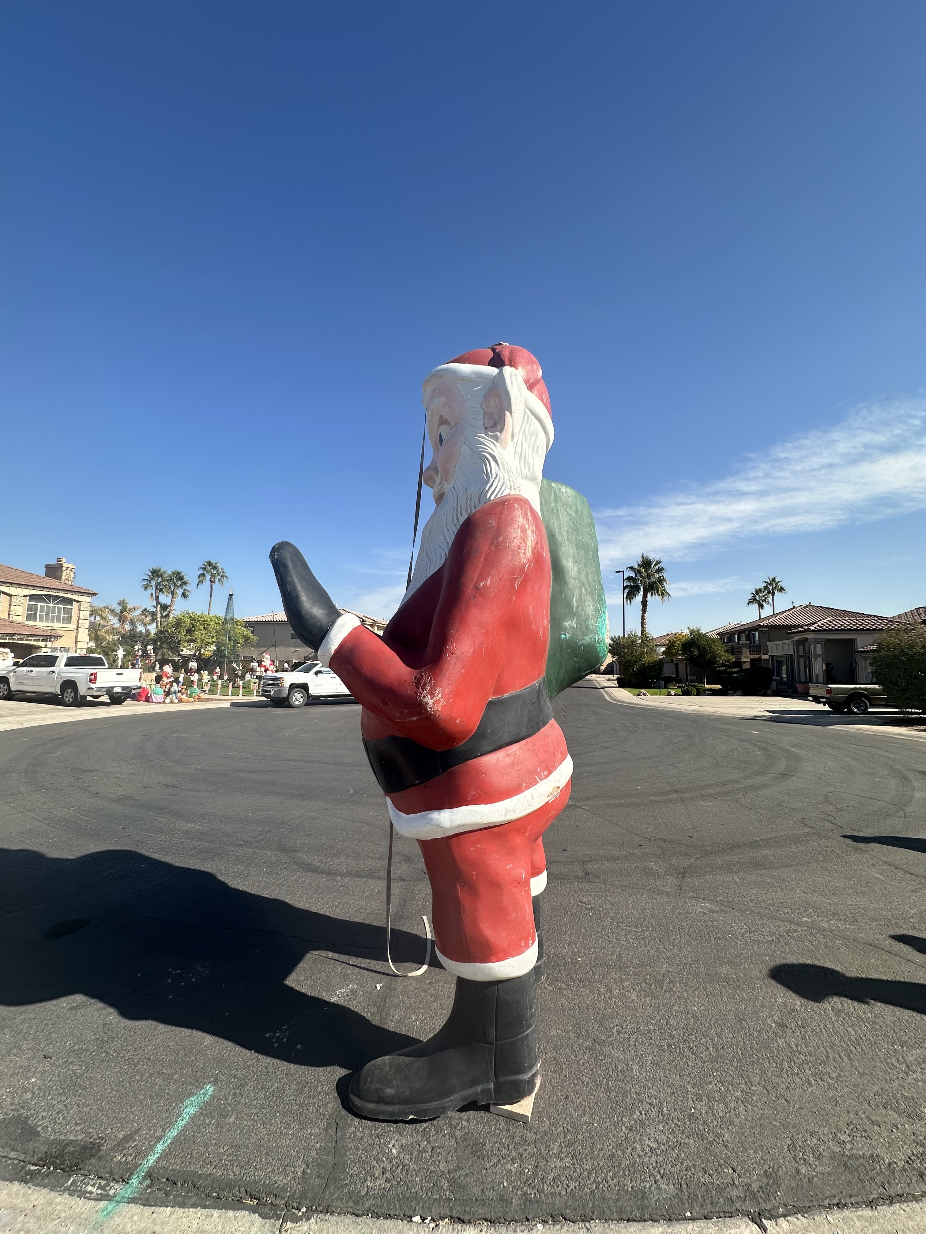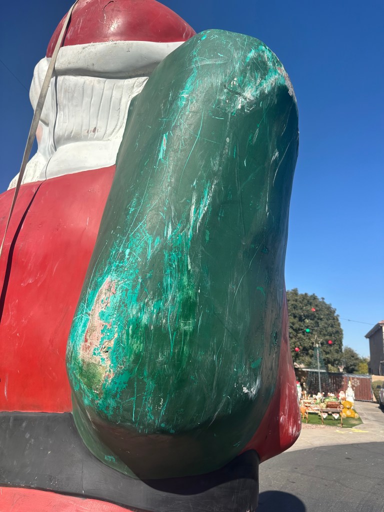 HISTORY  This original Santa was either made by Bob Prewitt in Lawndale, CA or possibly by International Fiberglass in Venice, CA after they purchased the mold from Bob. This particular one has unknown history of where he first went when he was made but we do know that he ended up in the Irvine, CA area by the 90s. He stood annually at Santa’s Garden a local seasonal Christmas garden center that sold trees and wreaths. In the early days he rotated between a few different shops but the last 10 years has only been located at the Irvine location. In the 90s he was stolen by some guys that had to much to drink at a nearby bar called Lucky John’s. The police were told to be on the lookout for the missing Santa. When an SUV went by with a Santa strapped to the roof the police gave chase. The Santa was recovered and even got his picture in the paper. The Santa was recently sold to a collector in Arizona who did not know what it was and discovered our Santa Video shortly after. Realizing there are collectors out there who like these freaky Santa’s he has decided to make it available in time for the Christmas season.