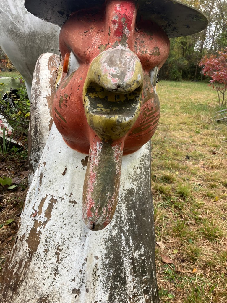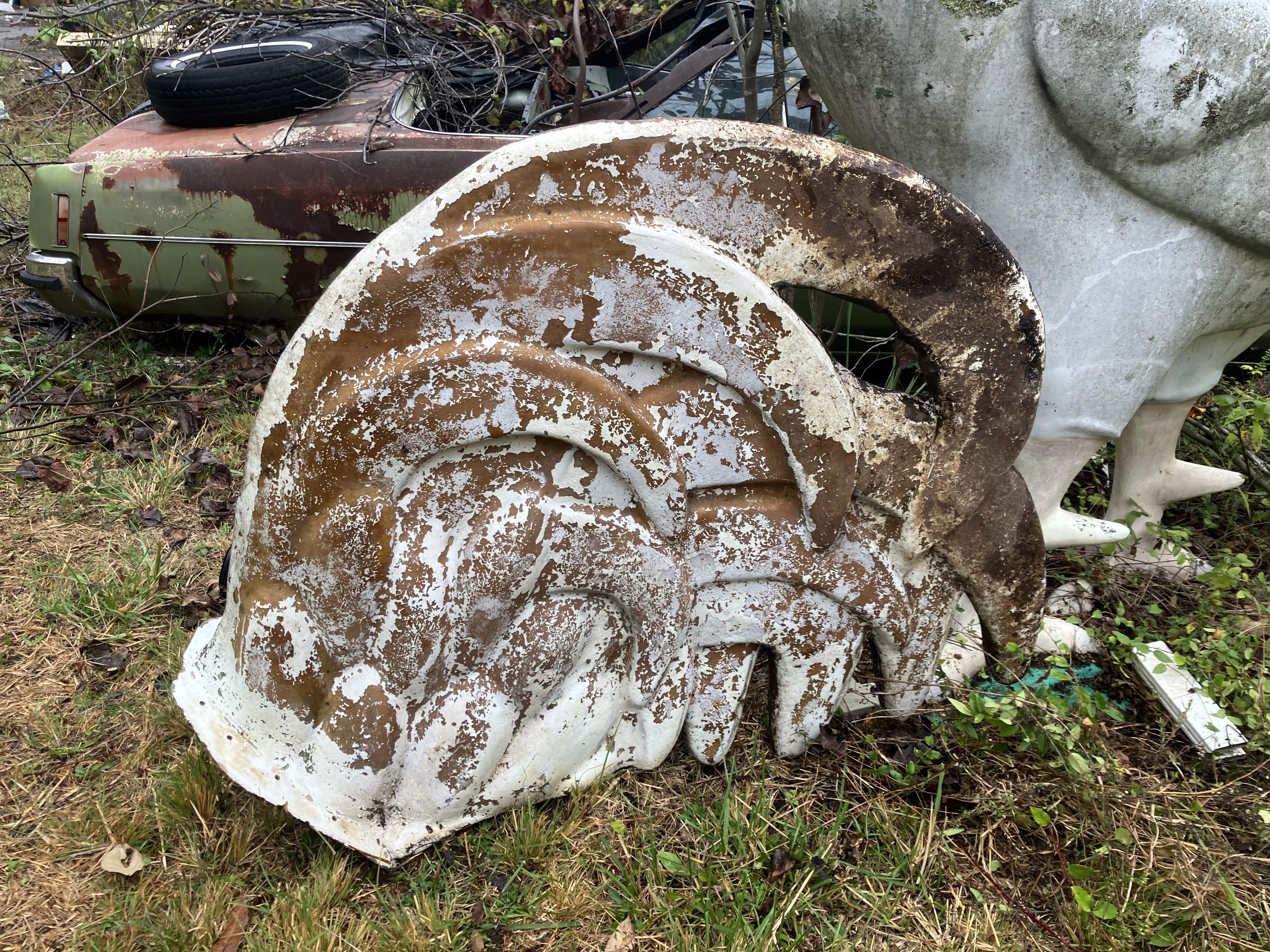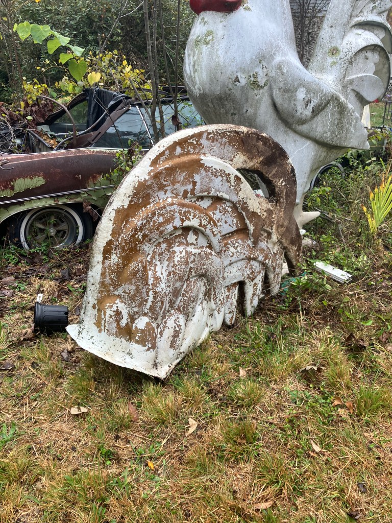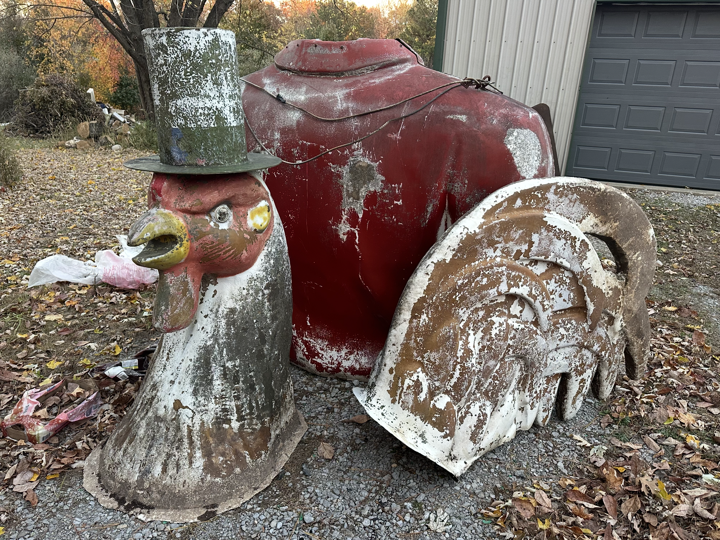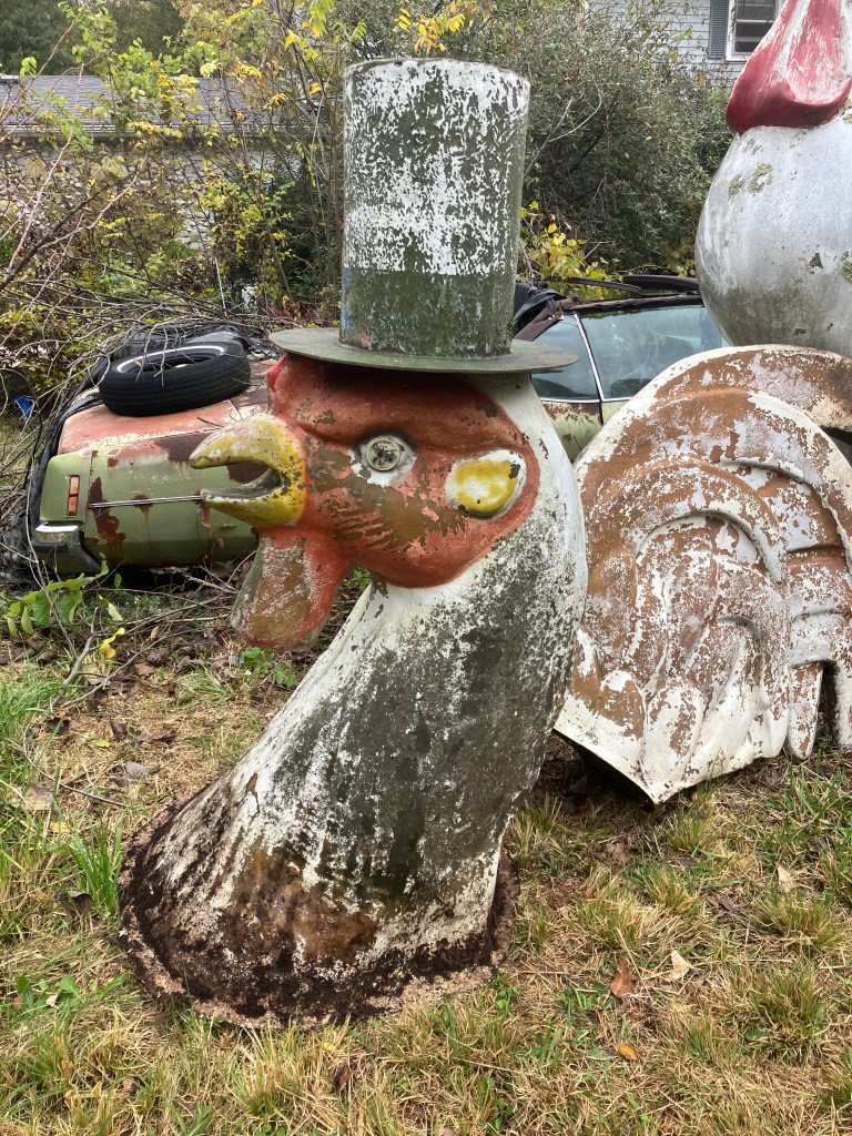 Chicken Car Topper History – This is an original Paul White Chicken Topper. This was most likely made in KY by Paul White sometime in the 70s or 80s and it is unknown if it was ever used on a car. The chicken comes in two pieces and has spent much of the last 20 years in outdoor storage. It is one of the more rare top hat versions compared to the more common version with no hat. This is the same style of chicken used on the Krekel cars in IL. The chicken comes as is and does need a restoration before it can be installed and used again. It can also be installed as a indoor display in it’s current vintage condition. Statue is located near Marion, IL. (Ends on Nov 30)