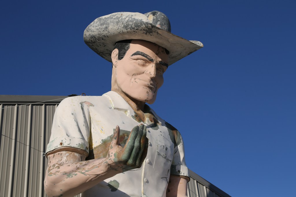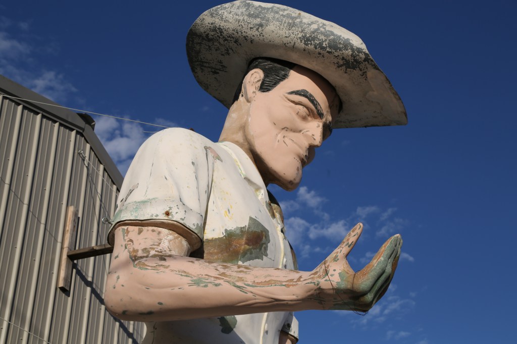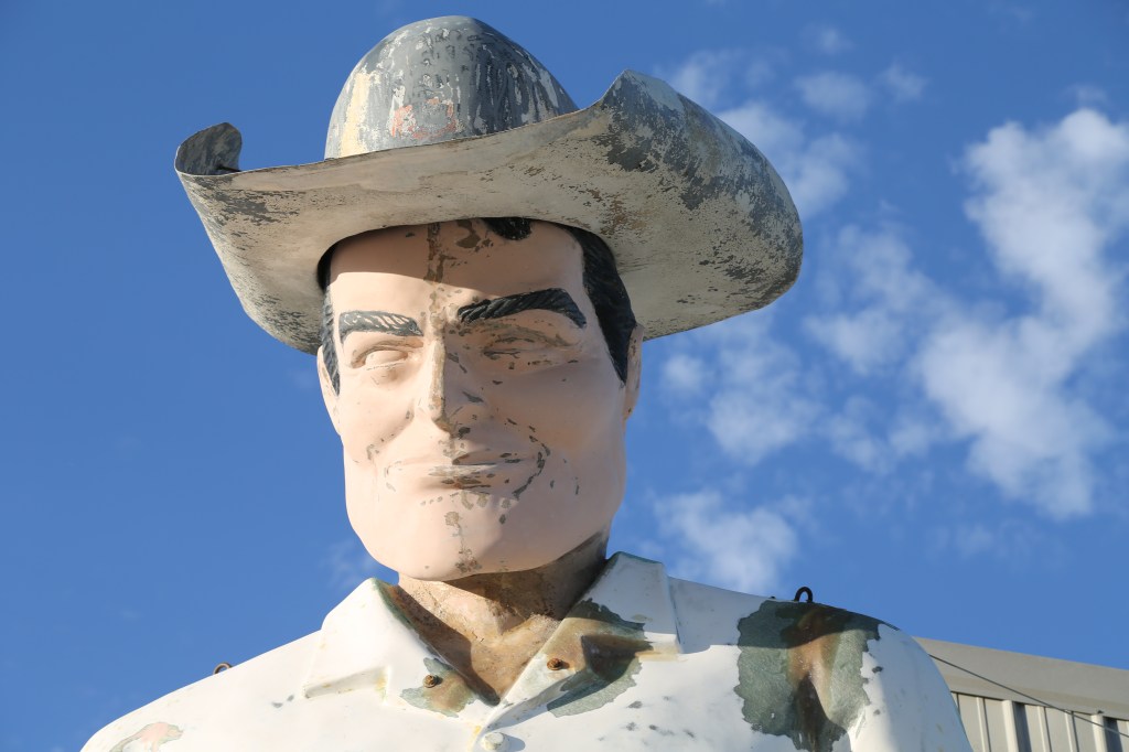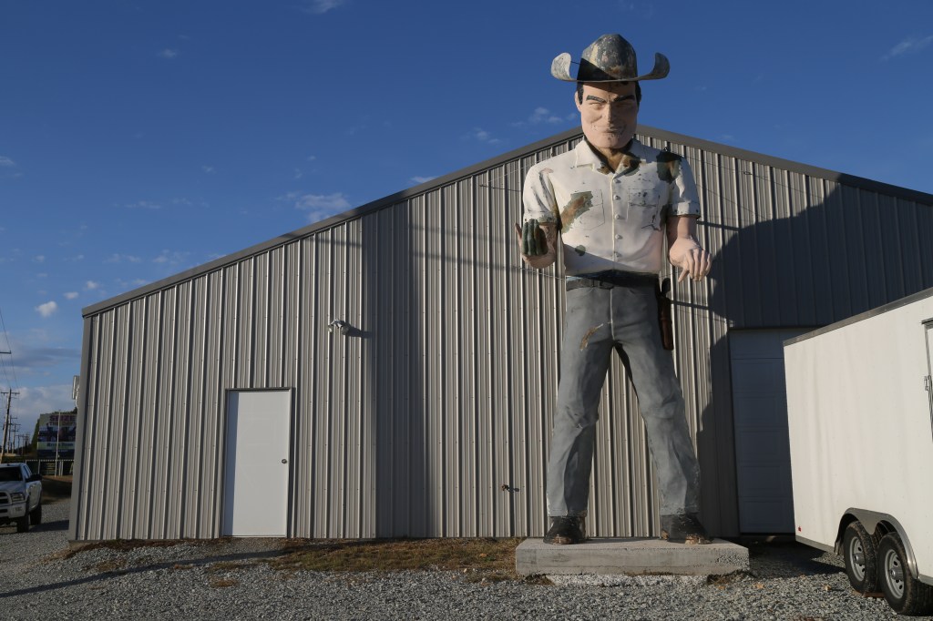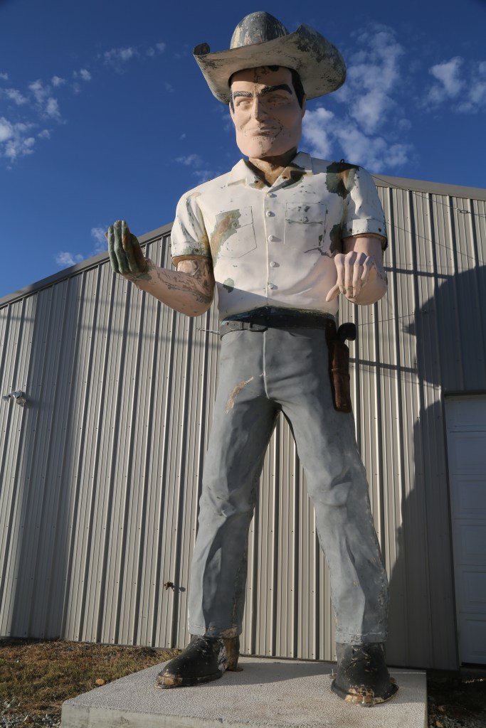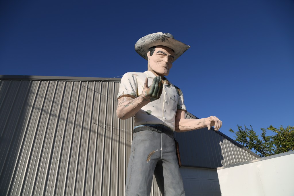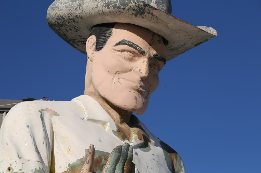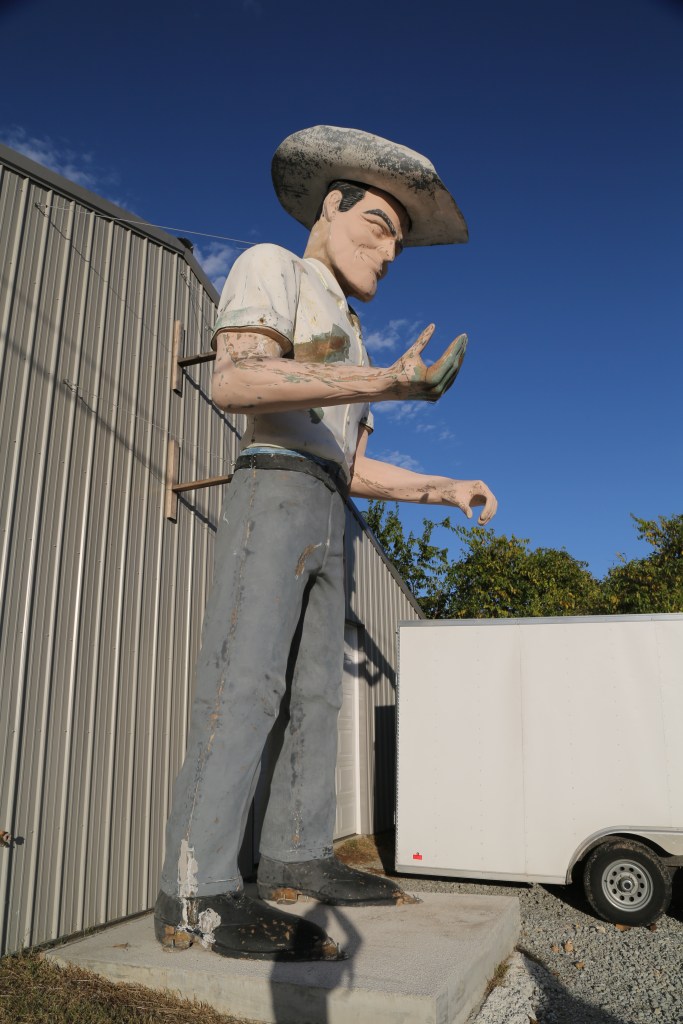 American Giants is happy to announce that another original Muffler Man was up for sale and has recently sold. The giant for sale was located in Copeland, OK. This particular cowboy is unique in that he still has his original six shooter and holster and belt! The giant was used as part of a roving promotion program in the late 60s for Phillips 66 and ended up in Afton, OK when the program ended. He was purchased by Don and Daisy Davis ran an antique store in Grove called “Don’s Swap Shop” and set the giant up. In 2009 the giant was taken down for repairs and never was set back up. In 2016 the giant was sold to the Copeland Switch where it stood until 2024 when it was sold to a buyer in Texas. American Giants handled the sale and you can watch the sale and history video below.