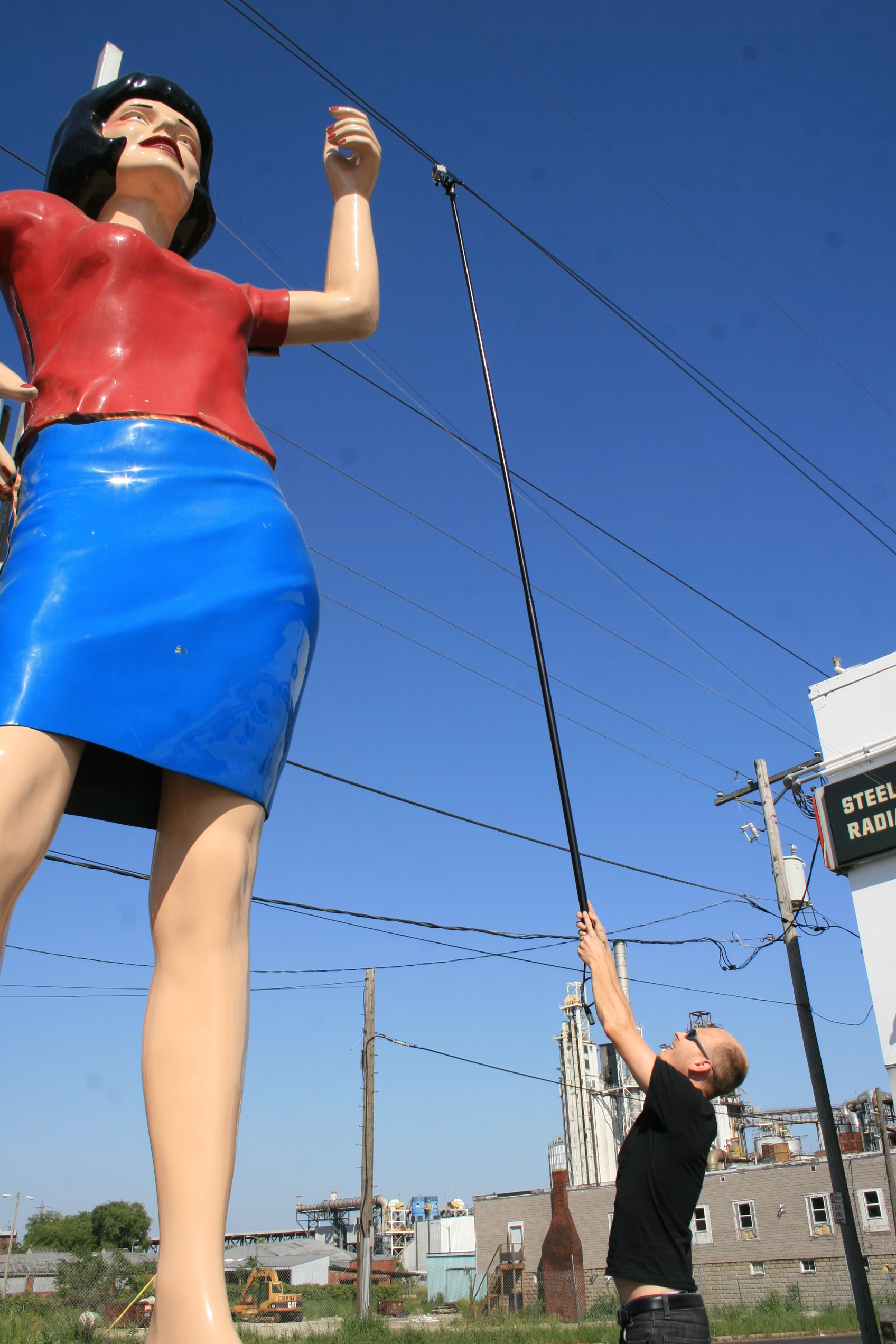 The idea was a success and the reason there are so many muffler men left today is because most of them were made in mass quantity for oil companies, chiefly Phillips 66. Their cowboys still cover large portions of the US with and without their cowboy hats. The texaco big friend sadly is a different story and Texaco was largely successful in destroying almost all 300 that were purchased except for 4 or 5 of them. Shortly after Texaco purchased their 300 in 1966 the Uniroyal company also wanted a statue to advertise their tires. So International Fiberglass came up with the idea to do something different and make a female version of the muffler man. She was sculpted by an unknown artist who supposedly had a thing for Jackie Kennedy and